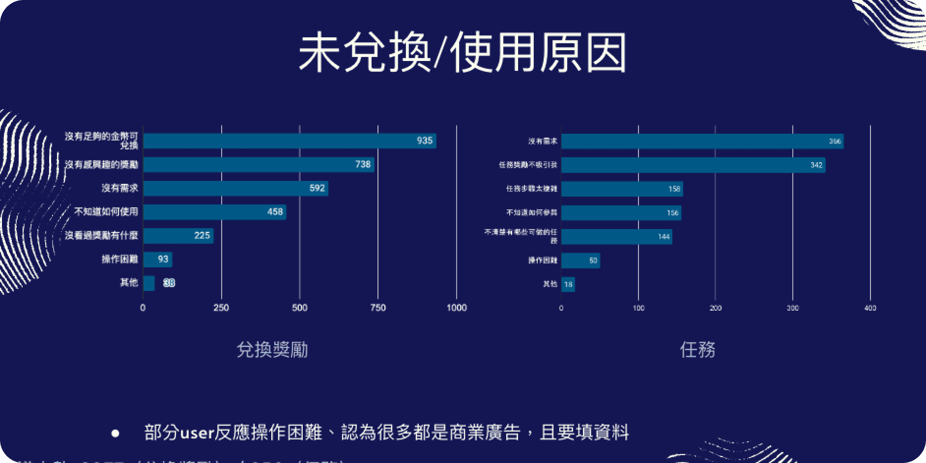 從問卷及後台可發現,發票存摺的受眾群在執行任務及兌換商品的意願是偏高的,但又容易因執行步驟複雜、認列機制不及時、兌換商品多樣性較低等多重因素,造成User容易在執行任務的過程中流失。