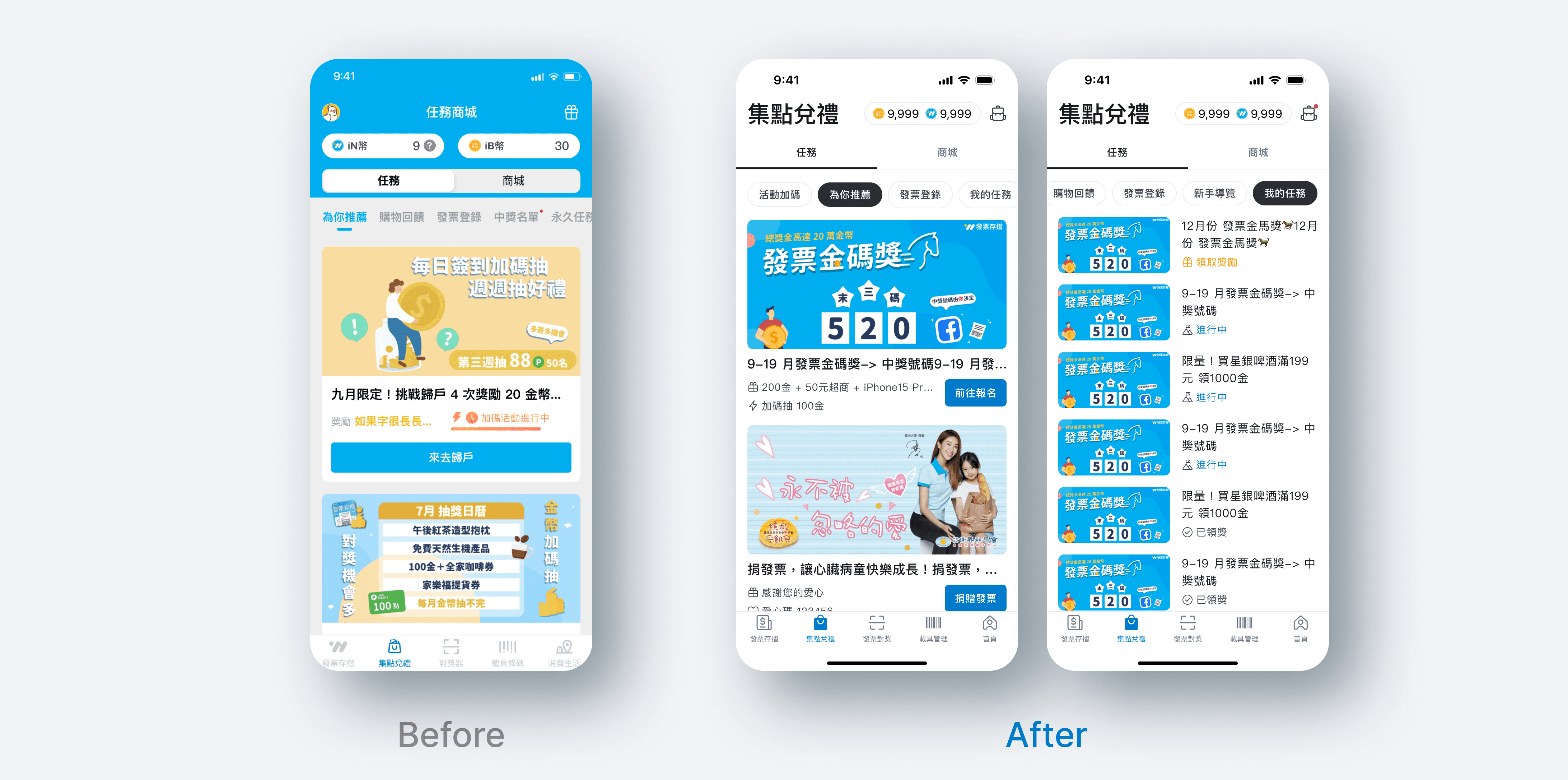 資訊架構及畫面介面及流程的重新調整,增加重點內容曝光,減少執行任務及兌換商品的斷點。